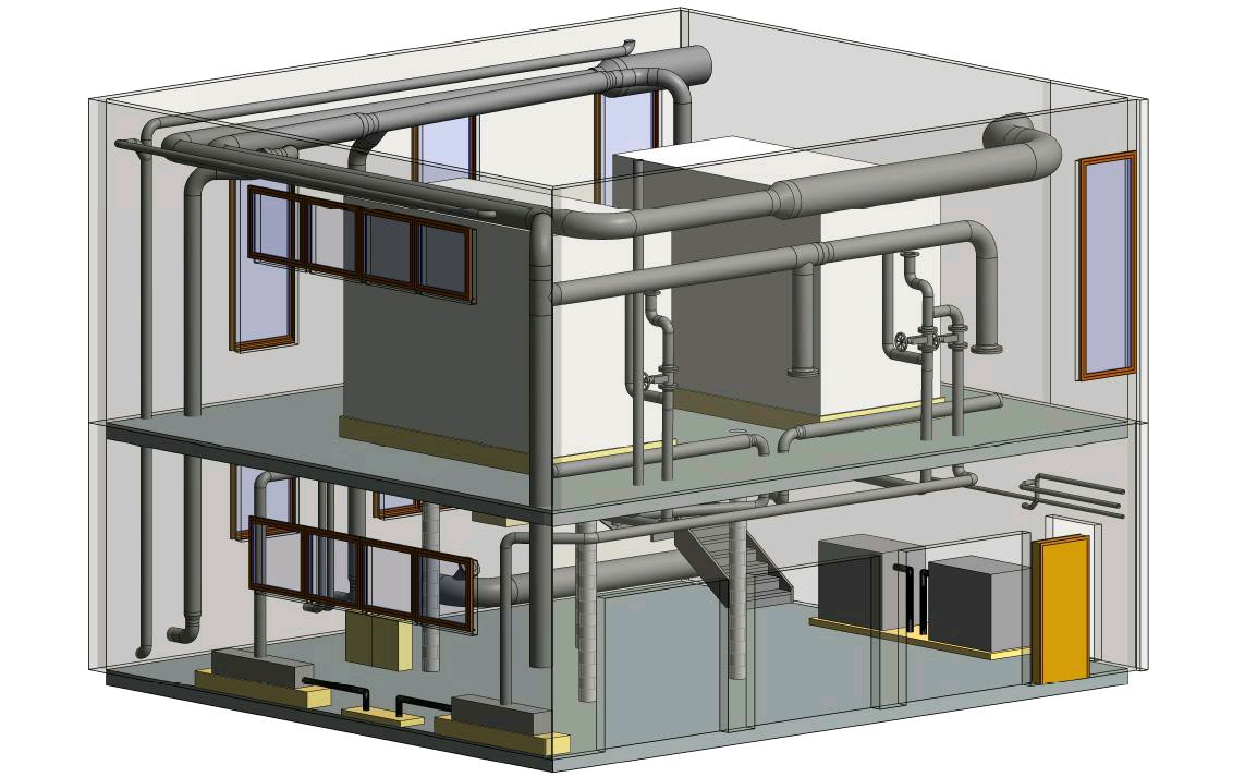 - Modélisation 3D du batiment, de la tuyauterie et de la machinerie.
